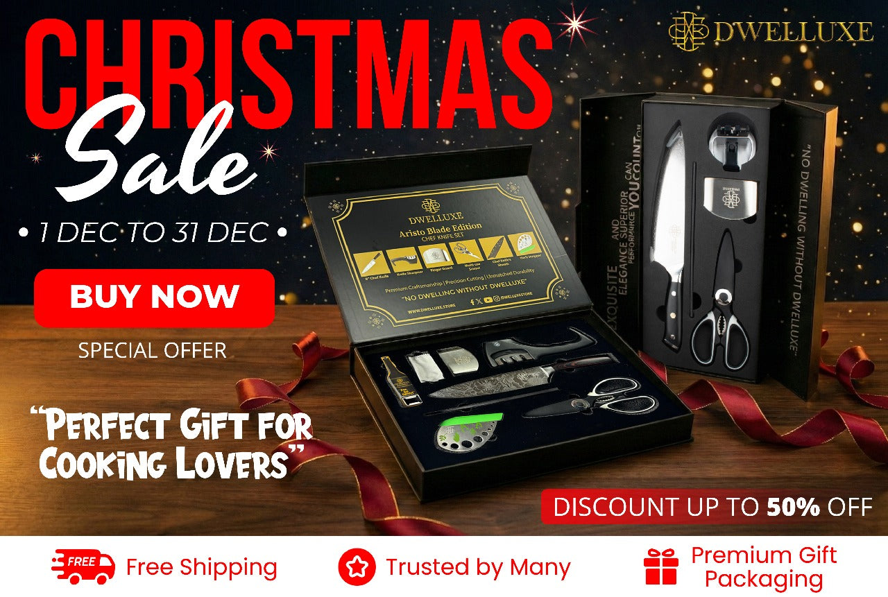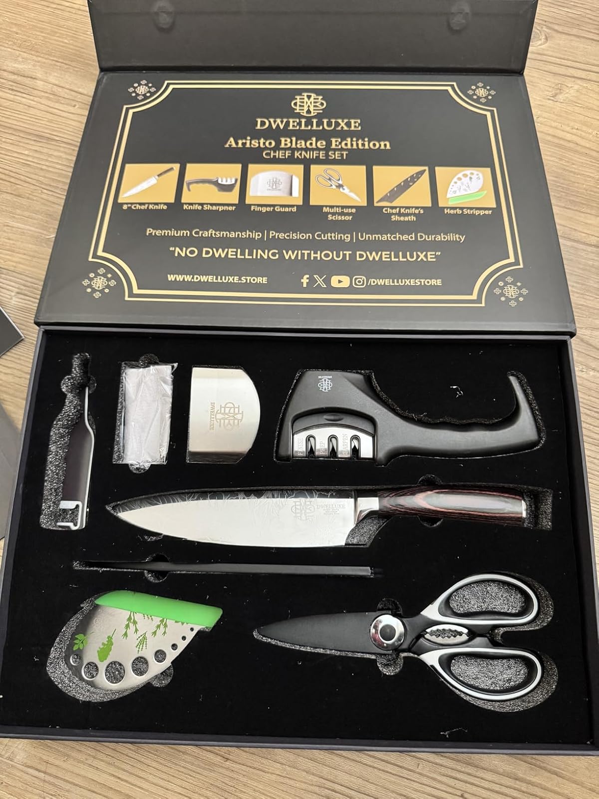 Dwelluxe Chef Knife, Ultra Sharp 8 inch Kitchen Knife with 7 Accessories, Professional, High Carbon Stainless Steel, Carving Knife with Pakkawood Handle, Luxury Gift Box for You, Family & Restaurant